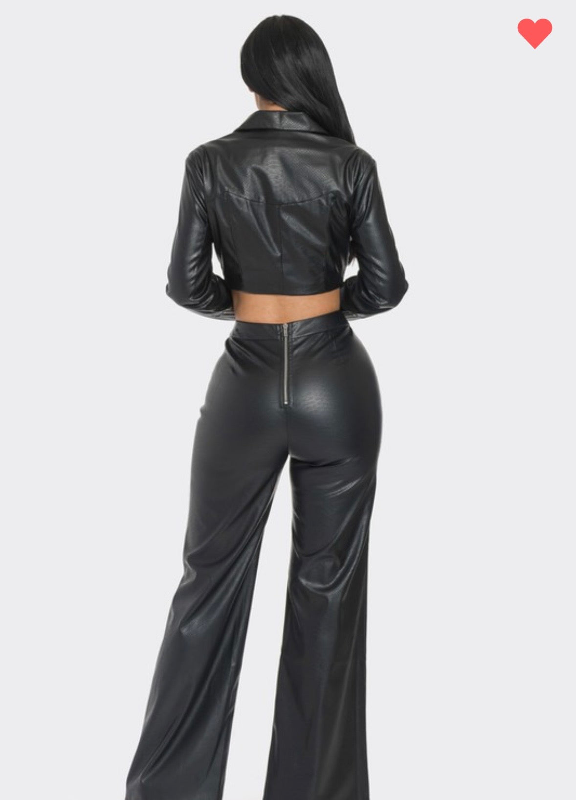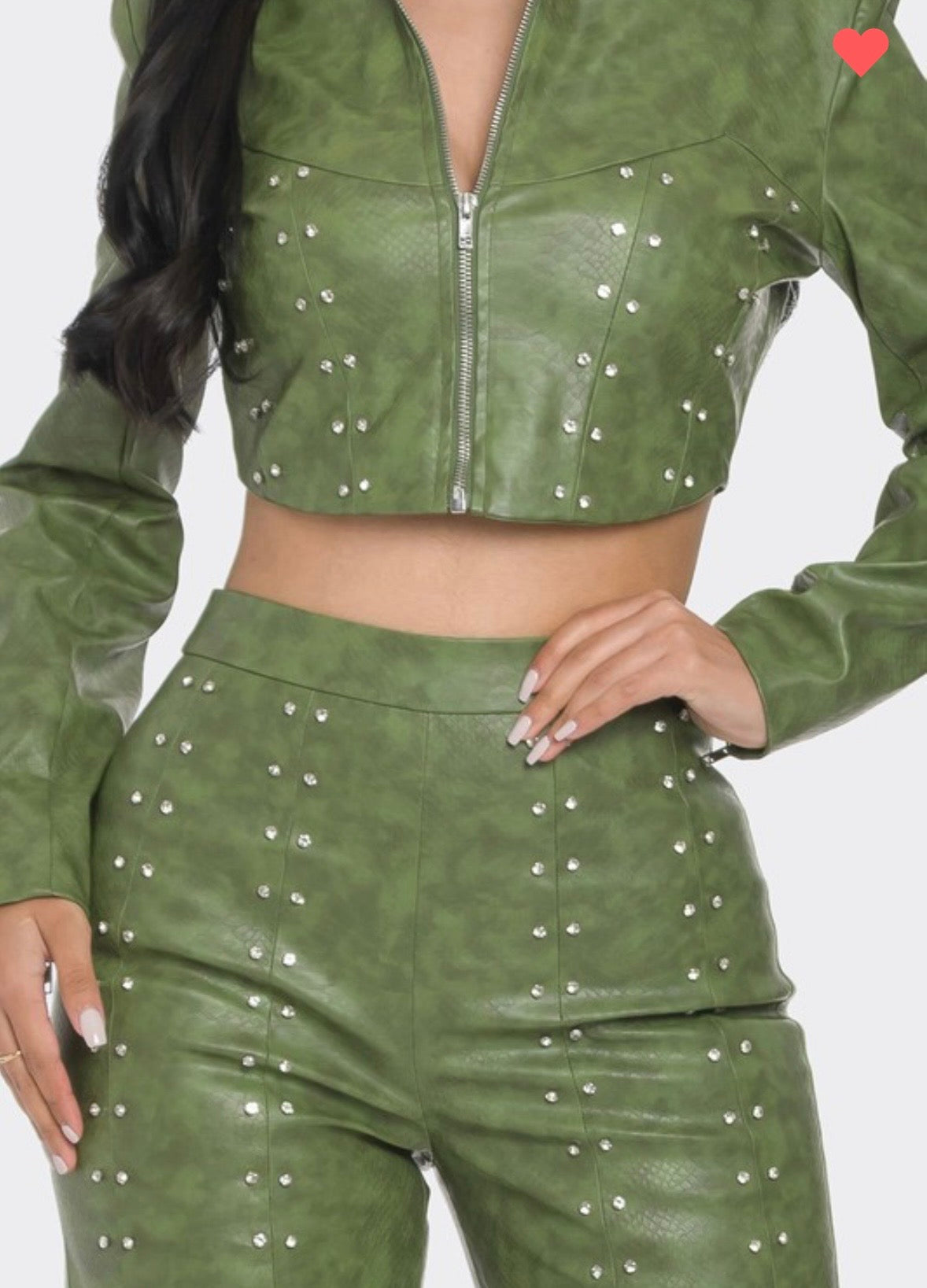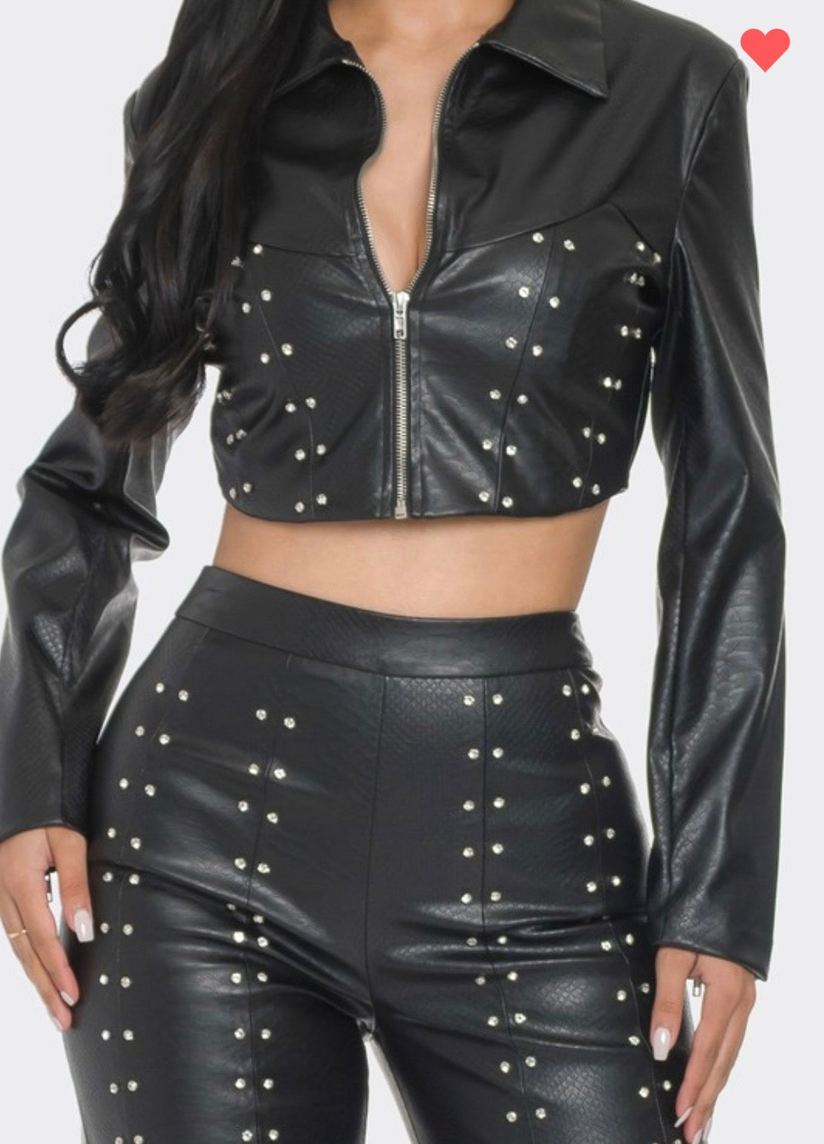 FEATURING A LONG SLEEVE CROPPED FRONT ZIPPER JACKET WITH PADDED SHOULDERS EMBELISHED WITH RHINESTONES AND TEXTURED PRINT. WITH A WIDE LEG